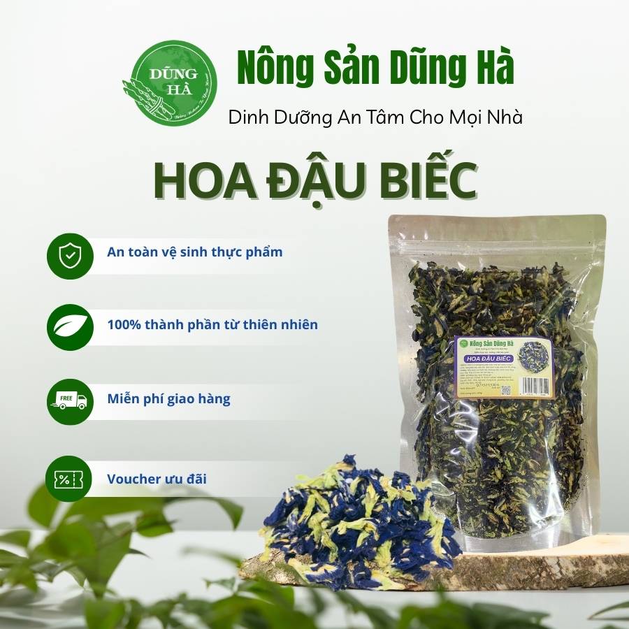 Đặc điểm: Hoa đậu biếc khô được thu hái từ những bông hoa tươi, sấy tự nhiên giữ nguyên màu xanh tím đặc trưng. Khi pha, nước cho ra sắc xanh biếc đẹp mắt, có thể chuyển sang tím hồng khi thêm vài giọt chanh. Vị thanh nhẹ, dễ uống.